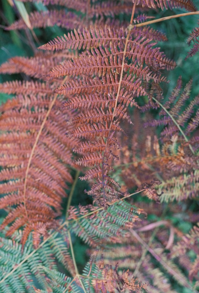 with the ferns growing pink and rusty in the woods